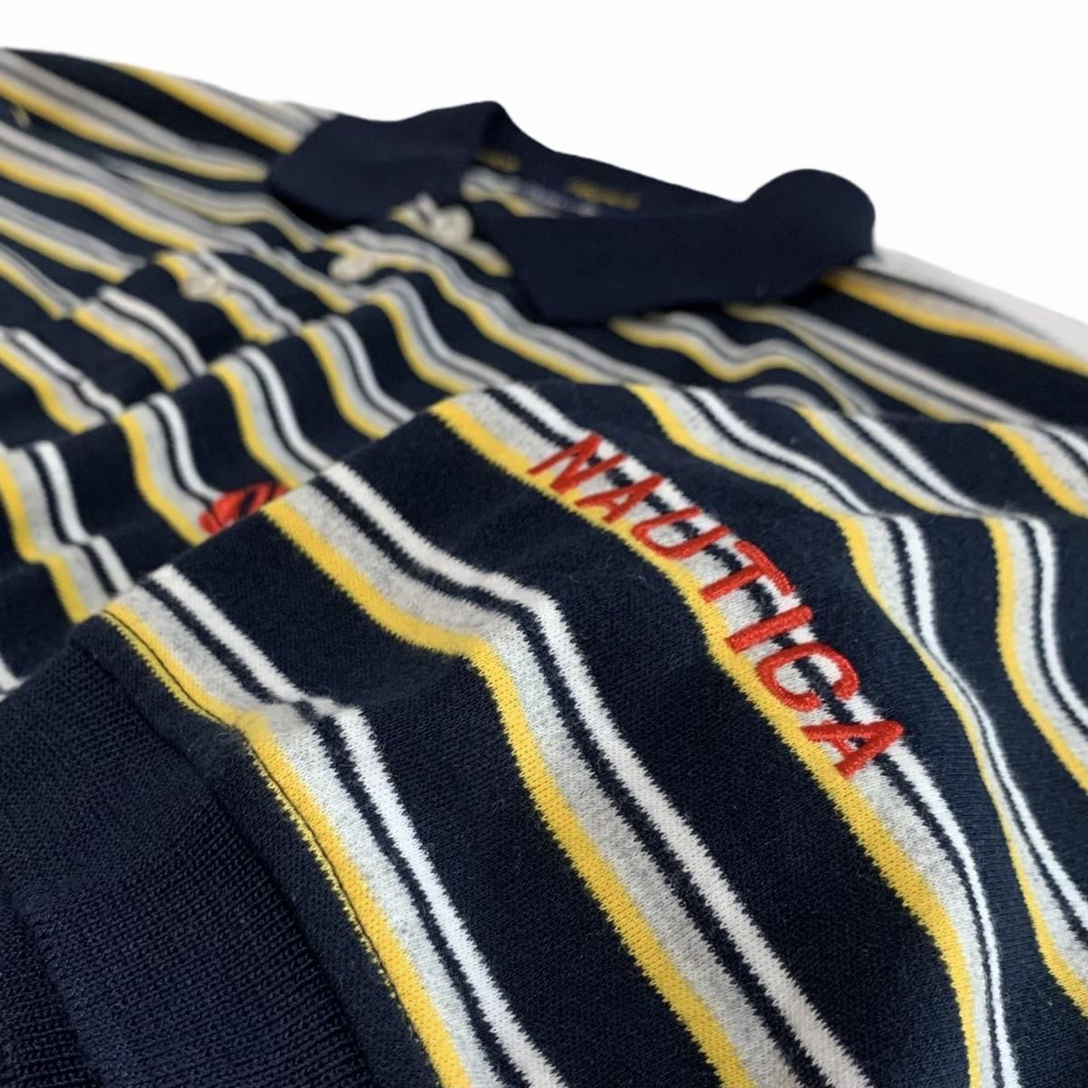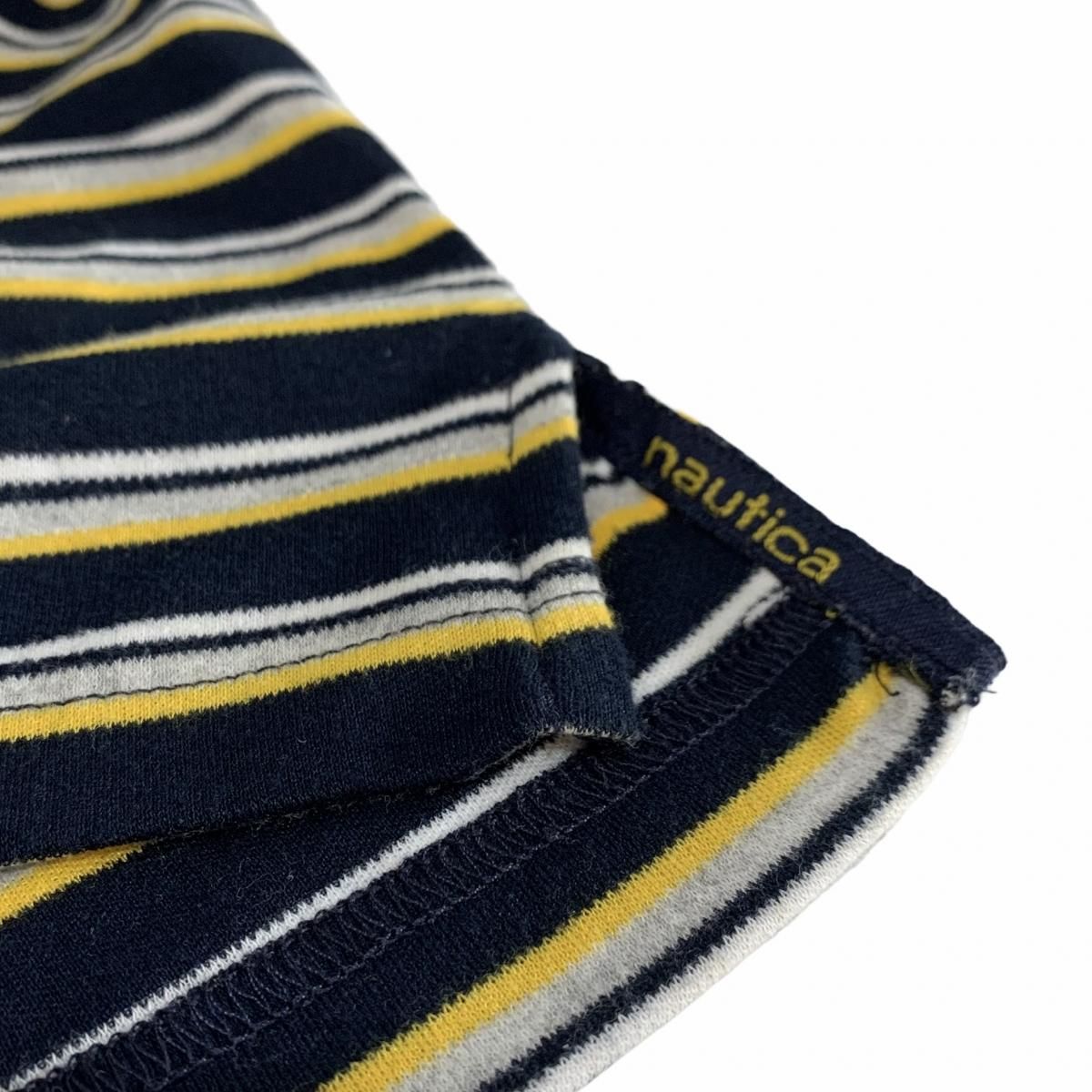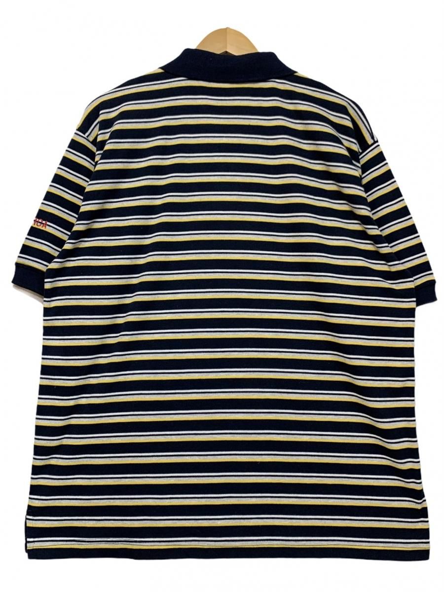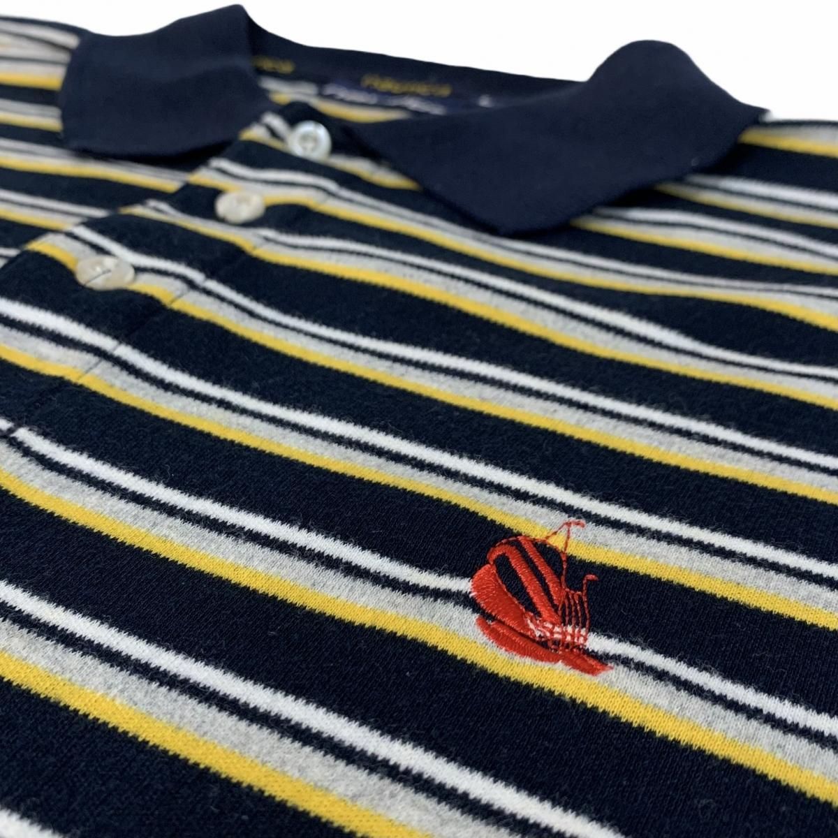 90s NAUTICA Border S/S Polo Shirt 紺黄 L ノーティカ 半袖 ポロシャツ ボーダー柄 ワンポイント ロゴ 刺繍 ネイビー 古着